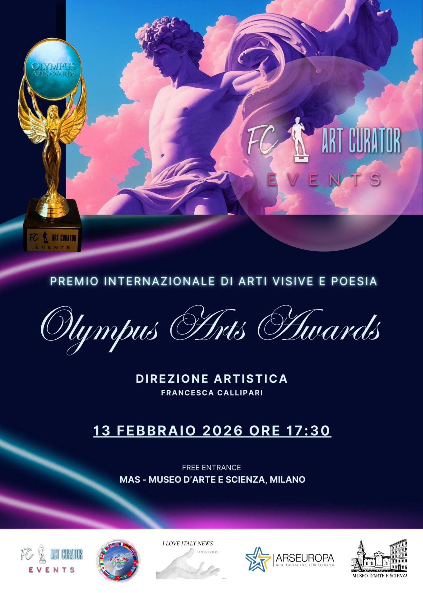 In concomitanza delle Olimpiadi di Milano Cortina, La FC ART CURATOR EVENTS, in collaborazione con I Love Italy News Arte e Cultura, è lieta di bandire la prima edizione del premio "Olympus Arts Awards". Il premio mira a creare un percorso emotivo e fisico che esplori la profonda resilienza dell'essere umano come punto di convergenza tra la disciplina atletica e l'espressione artistica. A tal proposito, le grandi tematiche del premio sono il CORPO, la LUCE, la RINASCITA/RIGENERAZIONE e l'AMORE.